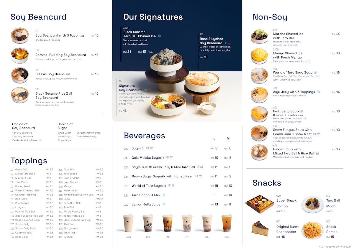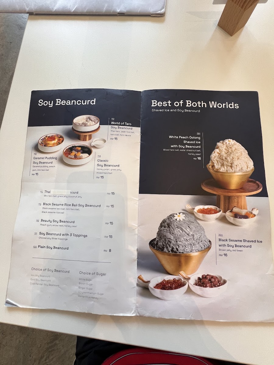 The menu boasts an array of toppings like Peanut Rice Balls, Rose & Lychee Jelly, and an exciting new addition, Cheese Foam, all priced around MYR 4.90. You can’t miss their signature taufufah, praised for its silky smooth texture and delightful toppings. For those in a hurry, grab & go options like the Pandan Soy Beancurd are perfect.